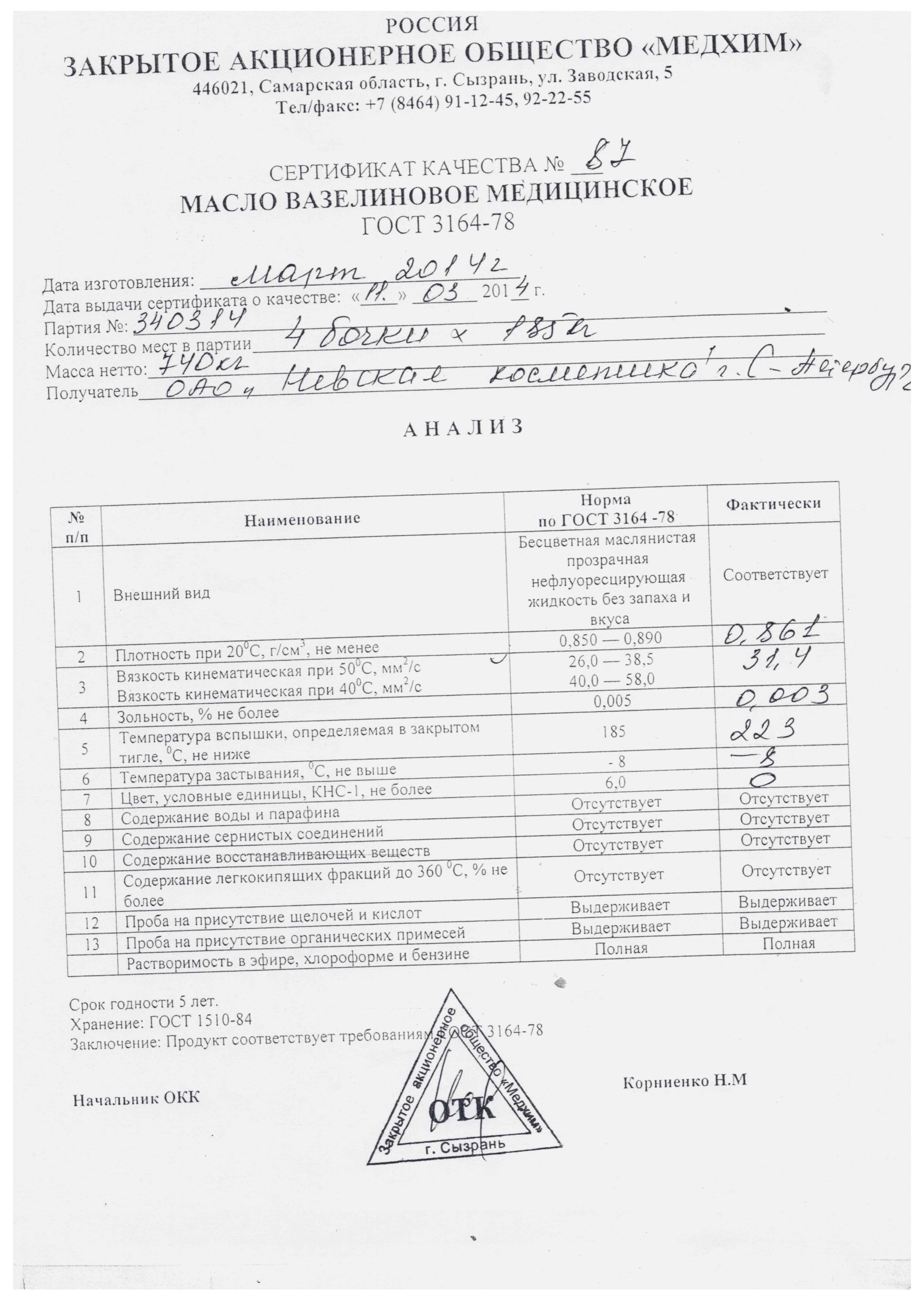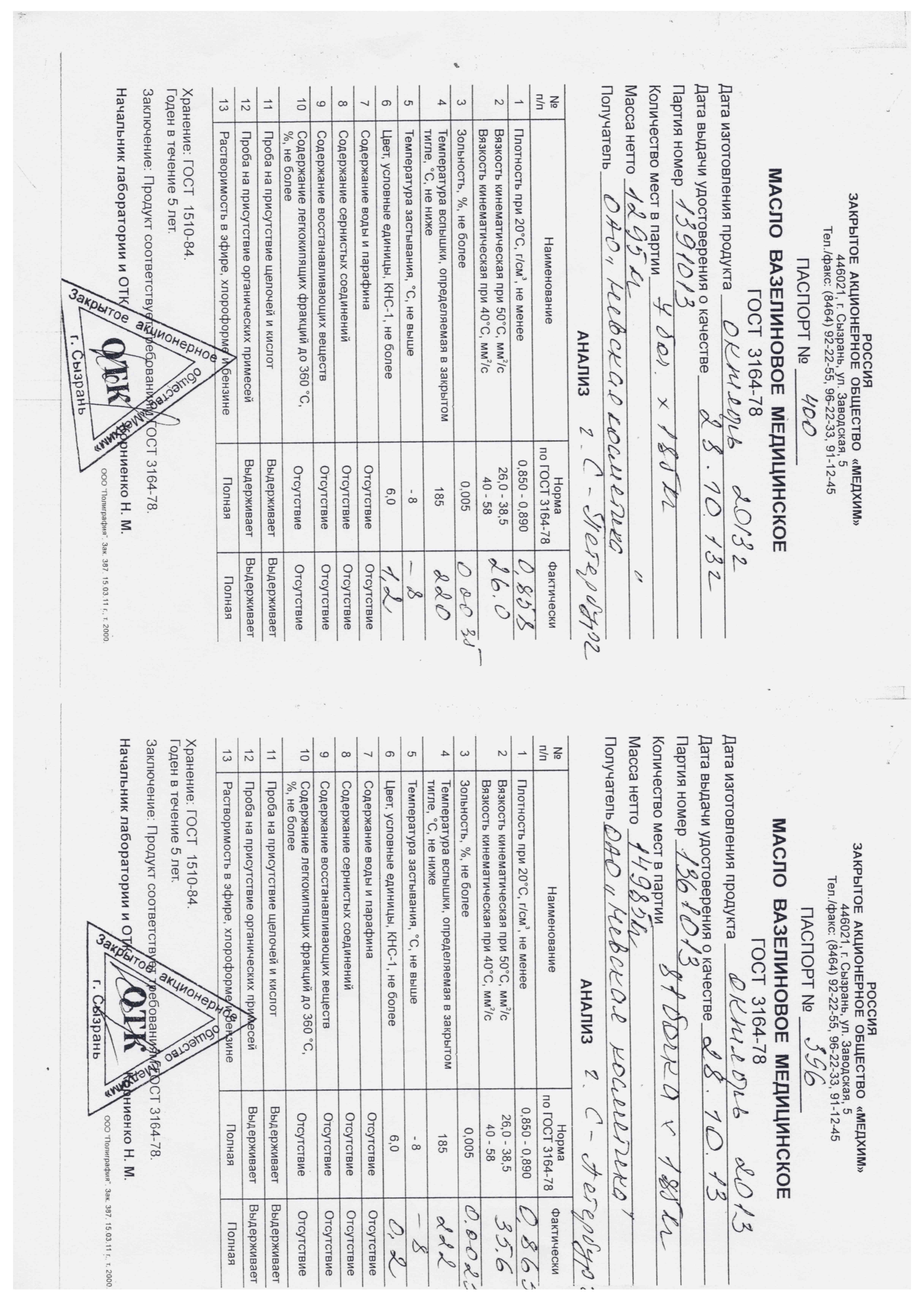 Масло вазелиновое медицинское ГОСТ 3164-78. Сгорает без запаха, копоти и сажи.