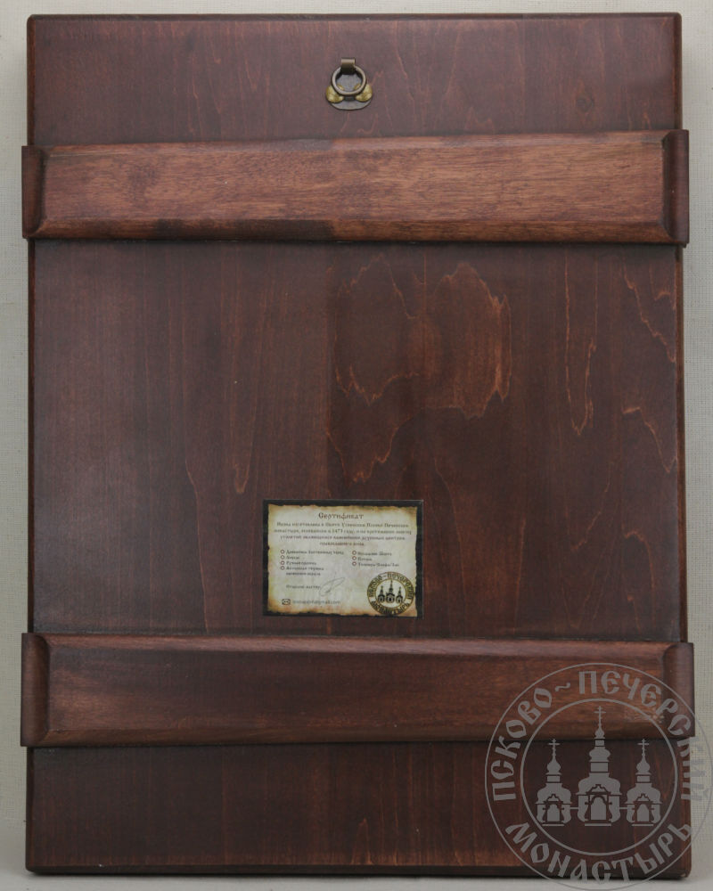 Иконы ручной работы Свято-Успенского Псково-Печерского монастыря изготавливаются вручную по авторской технологии в монастырской мастерской. Иконы выполнены на деревянных досках из лиственных пород древесины, в зависимости от размера укрепляются поперечными шпонками. Далее на доски наносится левкас с паволокой*, после чего на подготовленную доску по авторской технике наносится основное изображение высококачественными пигментными красками, стойкими к выцветанию. В дальнейшем икона переходит к мастеру позолотчику который покрывает икону позолотой из натурального золота** и передает икону иконописцу который завершает образ и подписывает икону.