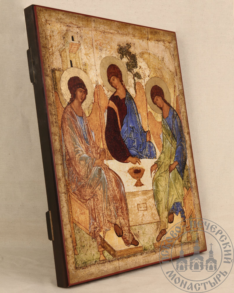 Икона ручной работы иконописной мастерской Псково-Печерского монастыря. Икона Святой Троицы, написанная Андреем Рублёвым в XV веке, является одной из самых прославленных русских икон, а также и одной из самых таинственных. В этом образе скрыт целый богословский кладезь, молитва воплощённая в красках, целый богословский трактат о Святой Троице. Никто, может быть, глубже не сказал о тайне Божественного Триединства так, как «сказал» Андрей Рублев. Образ «Троицы» – это учение о любви, о глубине единства духа и гармонии, записанное красками.