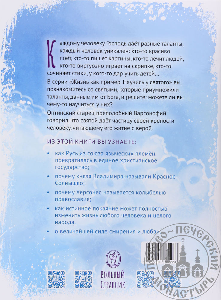 Книга рассказывает о князе Владимире Красное Солнышко, который прославился как креститель Руси. Благодаря тому, что князь выбрал христианство государственной религией, русский народ, просвещённый крещением, пронёс эту веру через многие века до нашего времени, породив множество святых. Полностью изменился после крещения князь Владимир, некогда поступавший по-язычески. О том, как это происходило, читайте в этой книге.